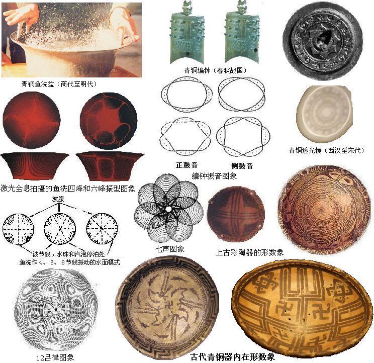 彩陶上的圖象和圖形,展現(xiàn)了上古文明的陳跡,是上文明的結(jié)晶,古埃及是幾何圖形見長,中國上古除了簡單幾何圖形,更多是形數(shù)象。五千年前,文字的發(fā)明,同時青銅器開始出現(xiàn)。中國中古夏代是由陶器向青銅器過渡的時期,殷商能鑄造精美的金器和青銅器。金屬所制的器物比粘土燒制的陶器更具活力,振動聲播、熱導(dǎo)電傳,比陶器優(yōu)越得多,好比近代的機械的熱動性、近現(xiàn)代電氣的電動性,現(xiàn)代電子的信息性,技術(shù)不斷更新。中古的青銅器治金和鑄造技術(shù),沒有現(xiàn)代技術(shù)先進(jìn),但青銅器一此特殊功能,卻令現(xiàn)代人嘆為觀止,難以模仿。青銅器關(guān)鍵是內(nèi)在的器構(gòu),不是外部形體結(jié)構(gòu)。商代為青銅器發(fā)展的頂盛時期,其鑄造技術(shù)一直延續(xù)至明代的近代機械鐵器鑄造興起才失傳。要問中國古代科技成就,眾人熟知的活字印刷、造紙、火藥、指南針的四大發(fā)明,這些都是小科技。中國古代高端科技是供人玩樂的中華青銅三大寶,魚洗盆、編鐘、透光鏡,其深藏科學(xué)的大道理。如圖〖古代青銅器內(nèi)在形數(shù)象〗所示,經(jīng)激光全息拍攝,青銅器內(nèi)在振動圖象,正是上古彩陶上的形數(shù)象,摩擦叩擊,洪鐘音樂,透光鏡正面采光,背現(xiàn)影像。中華青銅三大寶展示了中國古代科技工藝,采用了高超的系統(tǒng)數(shù)理,八卦符只是系統(tǒng)工具,形數(shù)象才是系統(tǒng)數(shù)理核心。