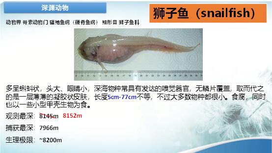 目前,對海斗深淵的生物系統(tǒng)還沒搞清楚。在海斗深淵,壓力是1噸/平方厘米、溫度低、光線暗、幾乎就是黑暗、地震也多。這里的生物的生命真是奇特,能在這樣的環(huán)境中生存和繁殖。我們的儀器下潛到水深萬米一下,也要經(jīng)受1噸/平方厘米的壓力,在設計上會遇到很多問題。