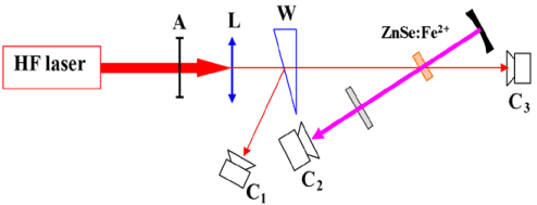 但是Fe2+:ZnSe激光器的實(shí)現(xiàn)也存在一個(gè)難點(diǎn),即在室溫下難以實(shí)現(xiàn)激光輸出,這是由其自身的能級(jí)特點(diǎn)所決定的。目前電子所采用自行研制的脈沖HF激光器泵浦Fe2+:ZnSe晶體,取得了比較好的效果,在室溫下實(shí)現(xiàn)了脈沖能量高達(dá)80 mJ的激光輸出。實(shí)驗(yàn)光路如圖2-11所示。實(shí)驗(yàn)未采用垂直入射泵浦方式,而采用小角度斜入射的泵浦方案,解決了雙色鏡鍍膜難的問題。