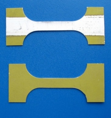 (3)安全性測試:將如圖3-4所示的經(jīng)過激光除漆和未除漆的兩組樣品分別編號(hào),采用美國MTS公司810型材料試驗(yàn)系統(tǒng)對(duì)兩組樣品首先進(jìn)行材料拉伸試驗(yàn)。在最能反映材料強(qiáng)度的抗拉強(qiáng)度一項(xiàng),除漆組樣品的平均值為399.6 Mpa,未除漆組的平均值為399.3 Mpa,兩組幾乎沒有差別。