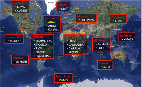 圖4 全世界暗物質(zhì)地下實(shí)驗(yàn)分布(暗物質(zhì)直接探測(cè))