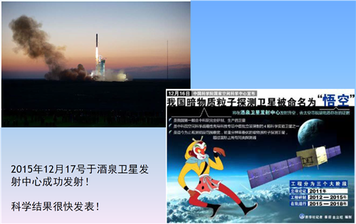 ■ 前景廣闊(從跟隨到引領(lǐng),暗物質(zhì)空間探測(cè),中國(guó)暗物質(zhì)粒子探測(cè)衛(wèi)星---悟空的重要發(fā)現(xiàn)---1.4TeV附近的尖峰,暗物質(zhì)湮滅信號(hào))。