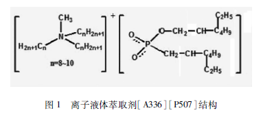 近年來我們開展離子液體萃取劑的研究,例如[A336 ] [ P507]。該結(jié)構(gòu)簡單的理解就是將P507進(jìn)行有機(jī)錢鹽的皂化,有機(jī)錢鹽常采用Aliquat336,國內(nèi)商品名稱為N263。[ A336 ] [ P507]的結(jié)構(gòu)如圖1所示,是一種典型的離子液體,所以我們稱之為離子液體萃取劑。