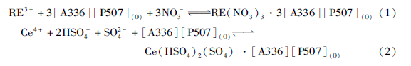 離子液體萃取稀土離子的過程機(jī)理還是比較復(fù)雜的,這種復(fù)雜來自于很多方面。其萃取稀土(III)和缽( IV)的機(jī)理還是以中性絡(luò)合機(jī)理為主,如萃取平衡方程(1)和(2)所示,同時(shí)可能還伴隨一些副反應(yīng)。該過程萃取稀土鹽,酸堿消耗比較小,是提高稀土萃取效率的重要方式之一。