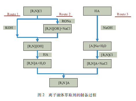 離子液體萃取劑的制備過程如圖2所示,包括將季錢鹽[R4N ]C1制備成季錢堿[R4N ]OH,然后與有機(jī)酸HA反應(yīng)生成[R4N]A?;蛘邔⒂袡C(jī)酸HA與堿反應(yīng)生成A一Na,然后與[R4N ]C1反應(yīng)生成[RQN]A。前一個(gè)制備過程,尤其是利用KOH更加簡單、低成本,產(chǎn)品的純度高。此外,離子液體萃取劑制備過程簡單,反應(yīng)時(shí)間短,條件溫和,產(chǎn)品收率高,適合大規(guī)模的生產(chǎn)。申請者利用工業(yè)原料N263 ( Aliquat336的國產(chǎn)化的商品)與P507制備的[A336][P507]價(jià)格僅為170元/千克左右。另外,離子液體萃取劑性質(zhì)穩(wěn)定,經(jīng)過多次循環(huán)仍保持其萃取性能。此外,其水溶性較低,溶解度一般小于50ppm。這些都符合大規(guī)模工業(yè)應(yīng)用的潛在條件。