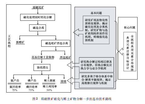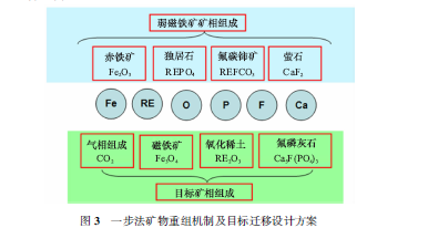 為實(shí)現(xiàn)上述目標(biāo),弱磁鐵礦磁化與稀土礦物分解一步法礦物重組機(jī)制及目標(biāo)遷移設(shè)計(jì)方案如圖3所示。