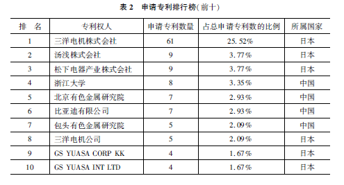 從不同年份上來看,中國專利不斷增加,原來口本比中國多,后來中國慢慢增多。但實(shí)用的還是不多,仍然還是一個(gè)問題,還得有進(jìn)一步的提高。另外,從申請單位來看,排在前十名的都是中國和口本的一些單位(表2)。比如說三洋電機(jī)株式會(huì)社、湯淺株式會(huì)社、松下電器產(chǎn)業(yè)株式會(huì)社、浙江大學(xué)、北京有色金屬研究院、比亞迪等。