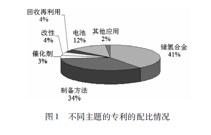 這里面是不同的研究主題分布,還是以儲(chǔ)氫合金的開發(fā)居多一點(diǎn),然后還有催化劑、改性等(圖1)。我覺得在這里面可能有三個(gè)領(lǐng)域在技術(shù)上發(fā)展比較突出一點(diǎn)。第一個(gè)就是成分的改變,通過改變儲(chǔ)氫合金成分開發(fā)新的合金提高了鎳氫電池容量,是一個(gè)很重要的進(jìn)步。傳統(tǒng)是ABS型的,后來跟ABS型的和AB2型的結(jié)合到一起,就變成了A2B7型的,這就是口本三洋公司開發(fā)出來的。這個(gè)儲(chǔ)氫合金成為了目前研究的主流,容量比傳統(tǒng)的要大很多,成分上的突破是一個(gè)很大的進(jìn)步。第二個(gè)是甩帶快淬技術(shù)在儲(chǔ)氫合金粉體制備上的應(yīng)用,原來這種技術(shù)最早是用來制備非晶態(tài)合金的,后來用到了永磁粉體的制備,現(xiàn)在又開始進(jìn)人到了鎳氫電池上面來了,對于鎳氫電池容量和穩(wěn)定性的提高都有非常大的幫助。第三個(gè)重要的突破的是儲(chǔ)氫合金表面改性,表面有一層鎳,可以進(jìn)一步提高電導(dǎo)率,增加電流。這三方面是在技術(shù)上有了比較大的提高和發(fā)展。