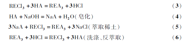 萃取分離過程主要利用有機(jī)萃取劑萃取料液中易萃組分,獲得高純度的難萃組分,通過洗滌有機(jī)相的難萃組分獲得純的易萃組分,達(dá)到分離目的。目前稀土分離均使用酸性萃取劑(HA),萃取過程可用反應(yīng)(3)表示,為了提高和穩(wěn)定萃取劑的萃取分離能力,一般均對酸性萃取劑進(jìn)行皂化后再與待分離的稀土料液進(jìn)行萃取交換,過程為反應(yīng)(4),(5),負(fù)載稀土的有機(jī)相用鹽酸進(jìn)行洗滌