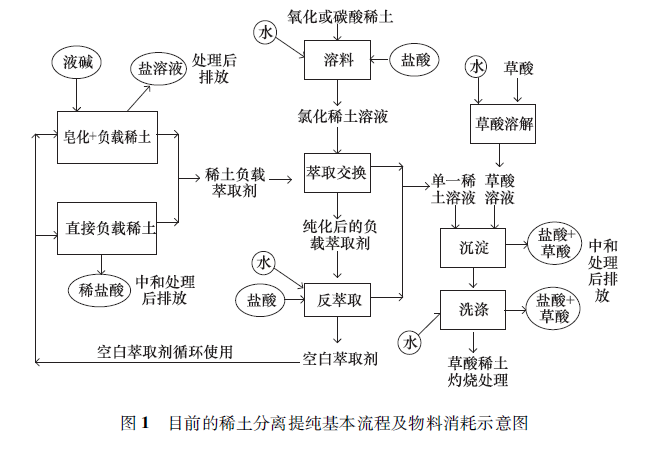 稀土溶液經(jīng)多級萃取洗滌實(shí)現(xiàn)稀土純化。由于稀土原料一般含有除樞,抗外的15個(gè)稀土元素,實(shí)現(xiàn)全分離需要多次重復(fù)上述過程,消耗大量酸堿。典型的中憶富鋪稀土分離酸堿消耗為每噸REOS一8噸鹽酸,2一3噸燒堿,15一20噸水。