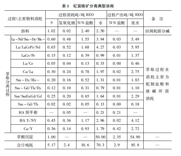 從目前的稀土分離基本工業(yè)流程,不難注意到,各段工藝間相對獨(dú)立,過程中消耗酸堿等化工原料和水,最終處理后作為廢水排放。以中憶富鋪稀土原料分離為例,典型試劑消耗如表1,每分離提純1噸稀土氧化物,消耗10噸左右的鹽酸、2. 4噸燒堿等化工材料,產(chǎn)生85噸廢水,其中含鹽量6. 8噸。
