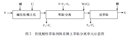 傳統(tǒng)酸性萃取劑體系稀土萃取分離流程,每一個(gè)分離單元的工藝如圖2所示,萃取劑有機(jī)相S需要用堿皂化,萃取難萃稀土A制取負(fù)載難萃稀土有機(jī)相,進(jìn)人分離段交換萃取分離對象(A和B)中的易萃稀土B以獲得純稀土A水相,隨后用純易萃稀土B洗滌萃取劑有機(jī)相中的難萃稀土A以獲得負(fù)載純易萃稀土B的有機(jī)相,最后用酸反萃取使B轉(zhuǎn)型至水相,萃取劑有機(jī)相得到再生循環(huán)使用。