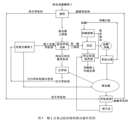 但是,聯(lián)動(dòng)萃取分離工藝還不足滿足稀土分離的綠色要求,為此提出進(jìn)一步發(fā)展聯(lián)動(dòng)萃取分離工藝和實(shí)現(xiàn)稀土分離物料聯(lián)動(dòng)循環(huán)的新設(shè)想。